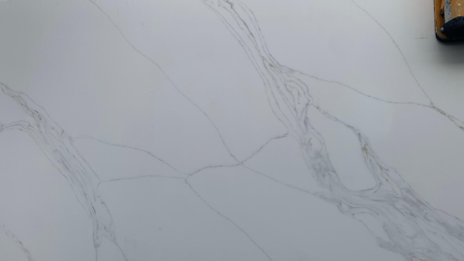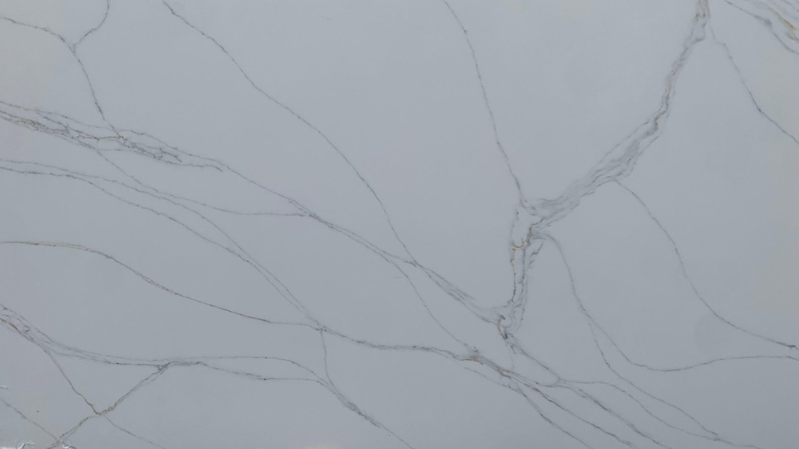 Calacatta Sorello is a refined, modern quartz surface inspired by the soft elegance of Italian marble. Its bright white background is accented with long, flowing grey veins and subtle golden undertones that create a calm, luxurious movement across the slab. The pattern is gentle yet sophisticated, making it perfect for designers and homeowners seeking timeless beauty without overpowering boldness.