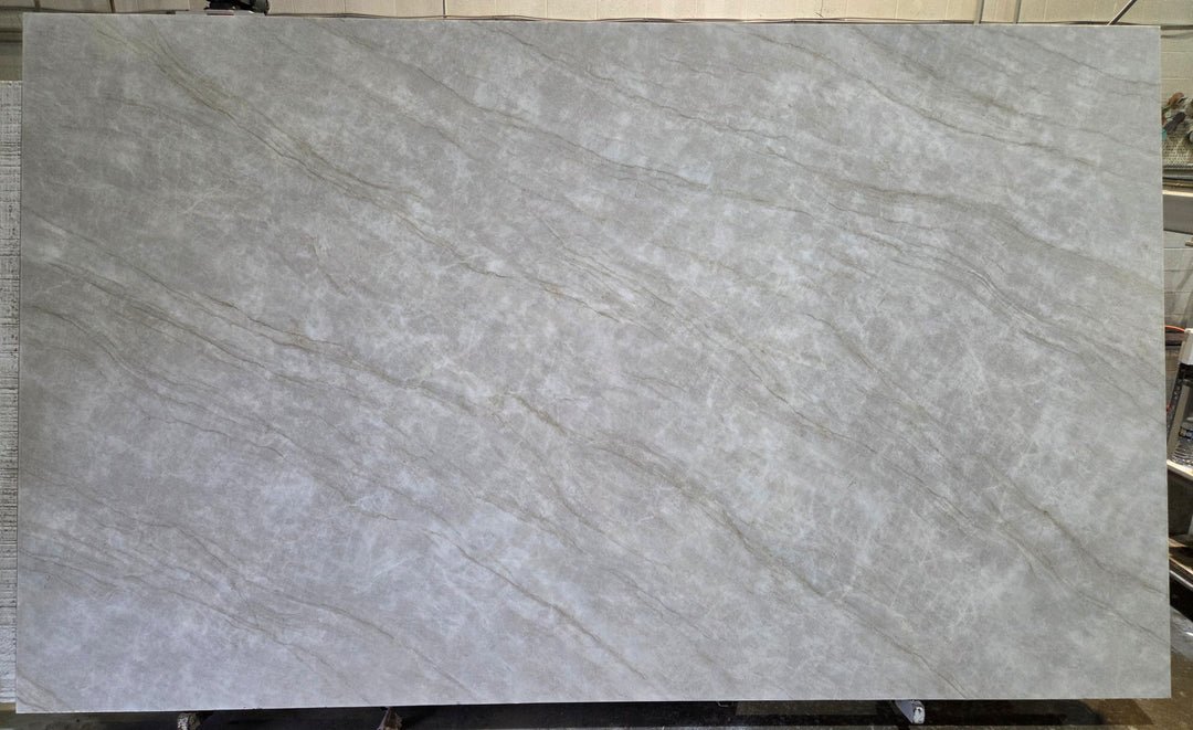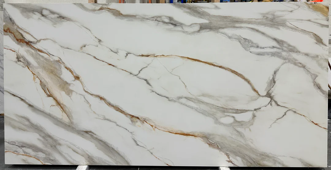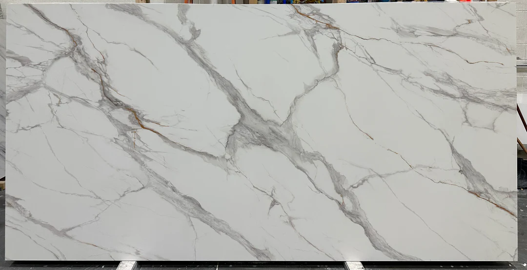 Calacatta Vento quartz brings a bold yet sophisticated look to any kitchen or bathroom. With a pristine white background and striking gray veins accented by hints of gold, this slab captures the classic beauty of Italian marble with a modern edge. The detailed veining adds depth and character, making it a perfect choice for anyone looking to elevate their countertop surfaces.